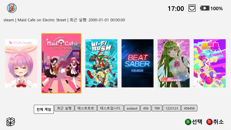 스팀 등록 부분을 작업완료 했습니다. 이제 성인 인증이 필요한 게임의 경우 브라우저를 열어 로그인 또는 성인인증을 받은 뒤 등록을 할 수 있습니다. 사용자 카테고리도 구현 완료. 이제 좋아하는 시리즈 별로, 장르별로 원하는대로 관리 할 수 있어요. 이 아이콘 또는 게임패드 Y버튼으로 게임을 카테고리에 넣을 수 있어요. 게임 등록은 자동으로 이루어 지지만, 성인인증이 필요한 게임의 경우 …