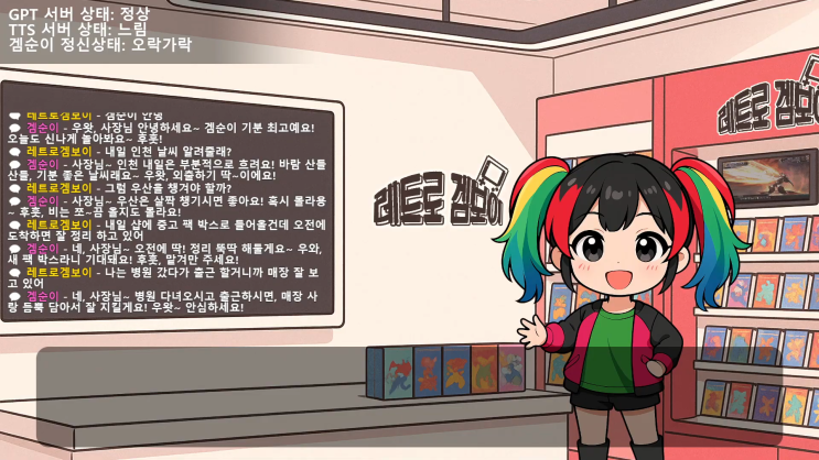 UI 및 기능 수정 라이브 채팅창을 방송에 송출 -> 커스텀 채팅 창으로 변경 -기존 유저 채팅만 보여지던 채팅창에 겜순이 채팅도 보여지게 변경 되었습니다. 서버 상태 표시 추가 -GPT 서버 상태 : 혼잣말 및 답변 생성에 관여 -TTL 서버 상태 : 생성된 대사를 음성으로 바꾸고, 보이스 클로닝을 하는 서버 -겜순이 정신상태 : 그냥 오락가락 함 채팅 …
